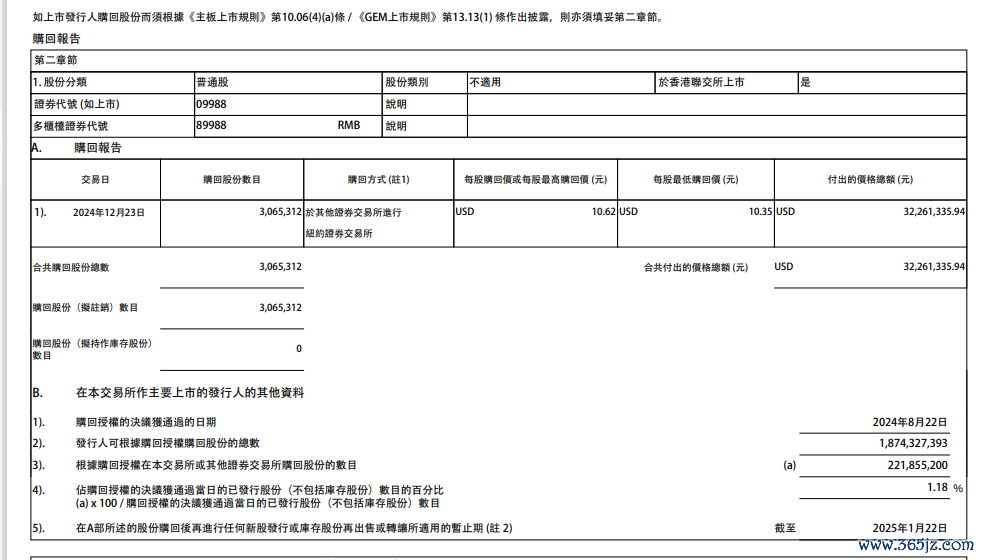 阿里巴巴斥资3226.13万美元回购306.53万股